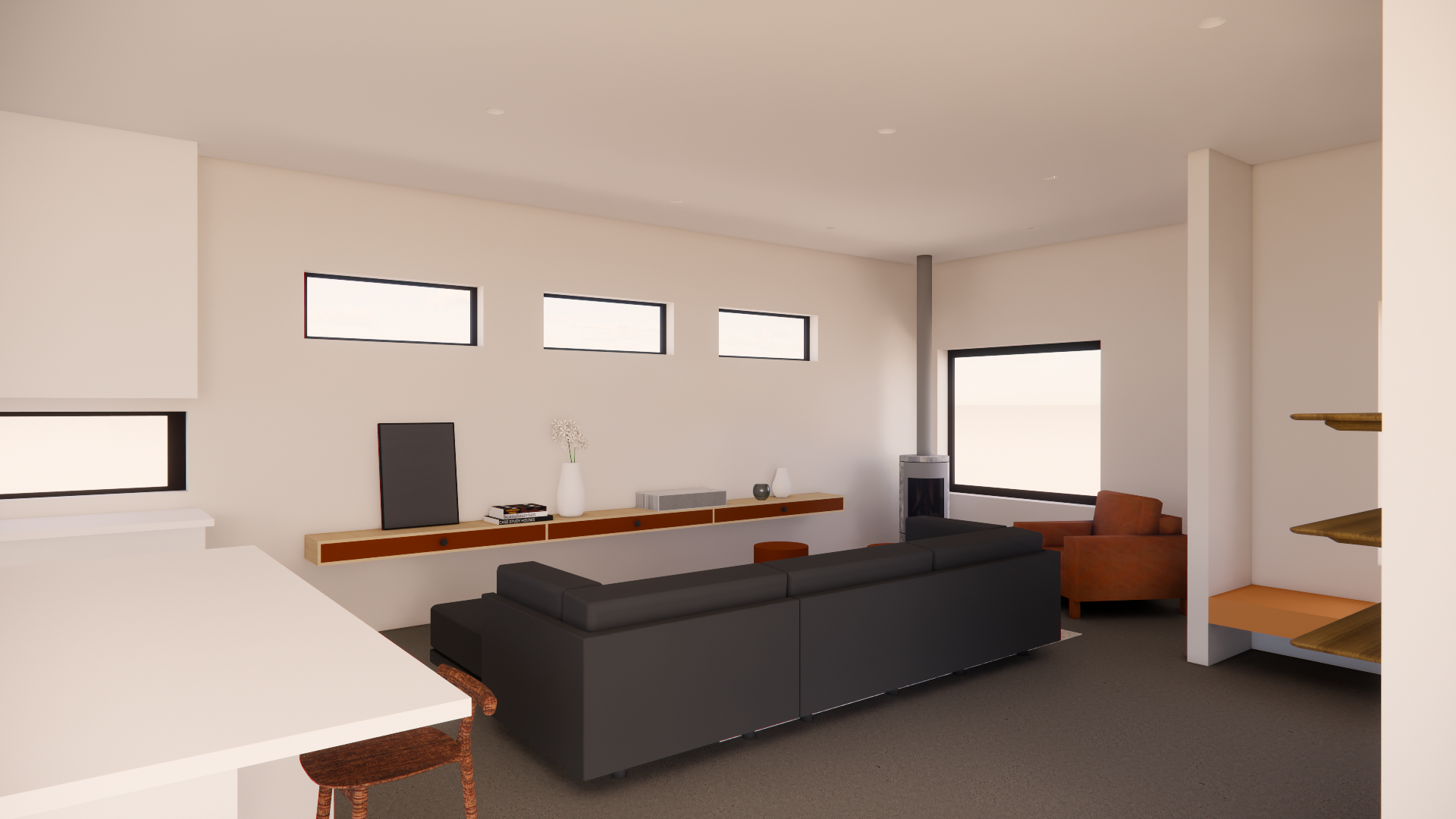 Walnut and leather details are echoed in the kitchen counter stools, reinforcing continuity throughout the main living spaces. An oversized sectional encourages relaxed, conversational seating, while an oval swivel chair creates a quieter, more intimate moment near the wood-burning fireplace and front window.