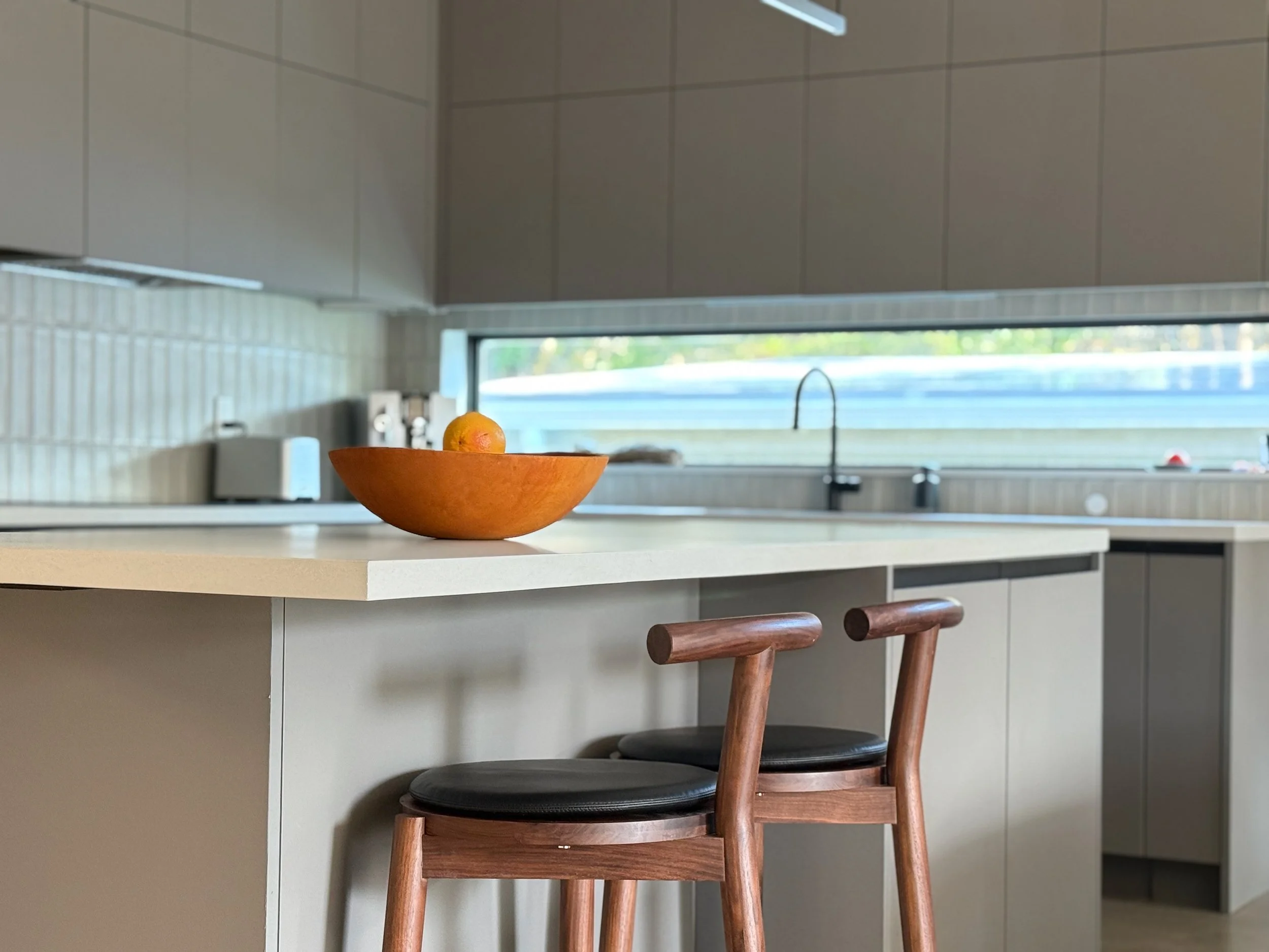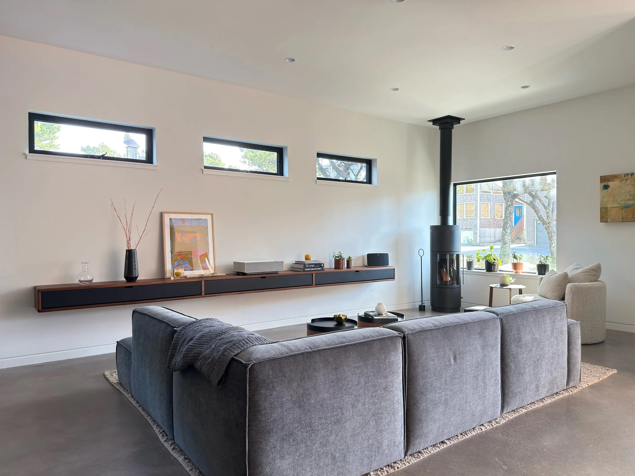 Inspired by the sandy dunes and wind-swept seagrass just beyond the home, we developed a materials palette that is neutral yet richly textured - softening the crisp white walls and polished concrete floors with warmth and subtle contrast. Anchoring the living room is a custom 15-foot walnut and black leather floating media cabinet, handcrafted by Oregon artisan Chaz Gibbins of Imago Furniture. Designed to accommodate a short-throw projector, the piece elegantly resolves the challenge of a wide wall punctuated by three high windows, while providing space for books, artwork, and game storage.